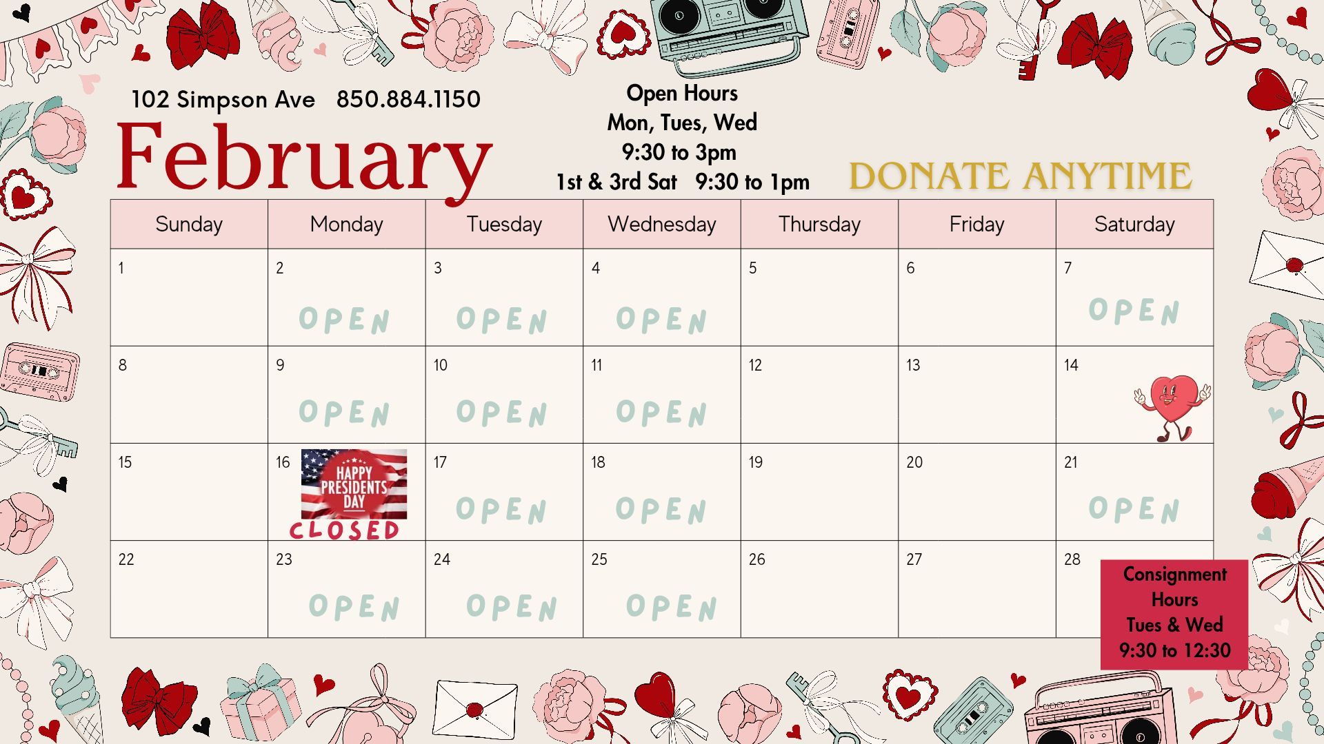 At the Hurlburt Thrift Shop, we offer consignment services. Our consignment hours of operation are Tuesdays and Wednesdays from 9:30 a.m. to 12:30 p.m. Attached below is our consignment contract.